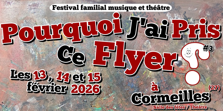 La compagnie Zig et Lili organise la troisième édition du festival théâtre et musique “Pourquoi j’ai pris ce flyer” à Cormeilles (27). Notre compagnie est née en 2016 et a pour vocation de promouvoir la culture en milieu rural. Le festival “Pourquoi j’ai pris ce flyer” est né de cette volonté. Vous pourrez y découvrir, au delà des spectacles, quelques stands associatifs et profiter de la buvette et de la restauration sur place.