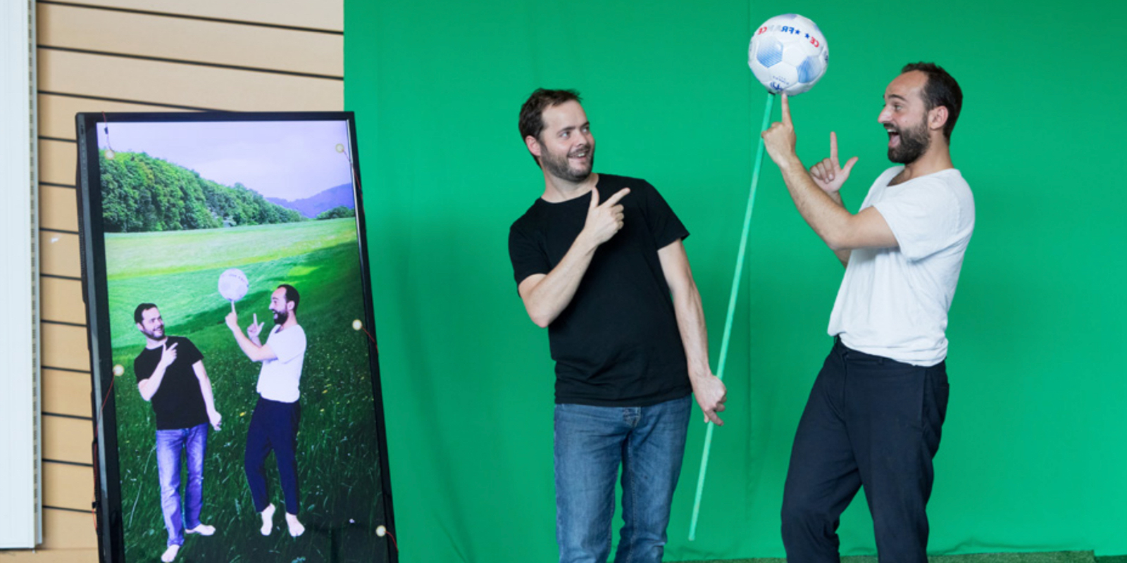 Le dispositif original nous plonge dans une sorte de studio de cinéma, avec un fond vert ou bleu et une caméra. Les 2 artistes s’amusent ainsi à détourner leurs techniques de cirque à travers toutes sortes de jeu d’incrustation dans l’image.